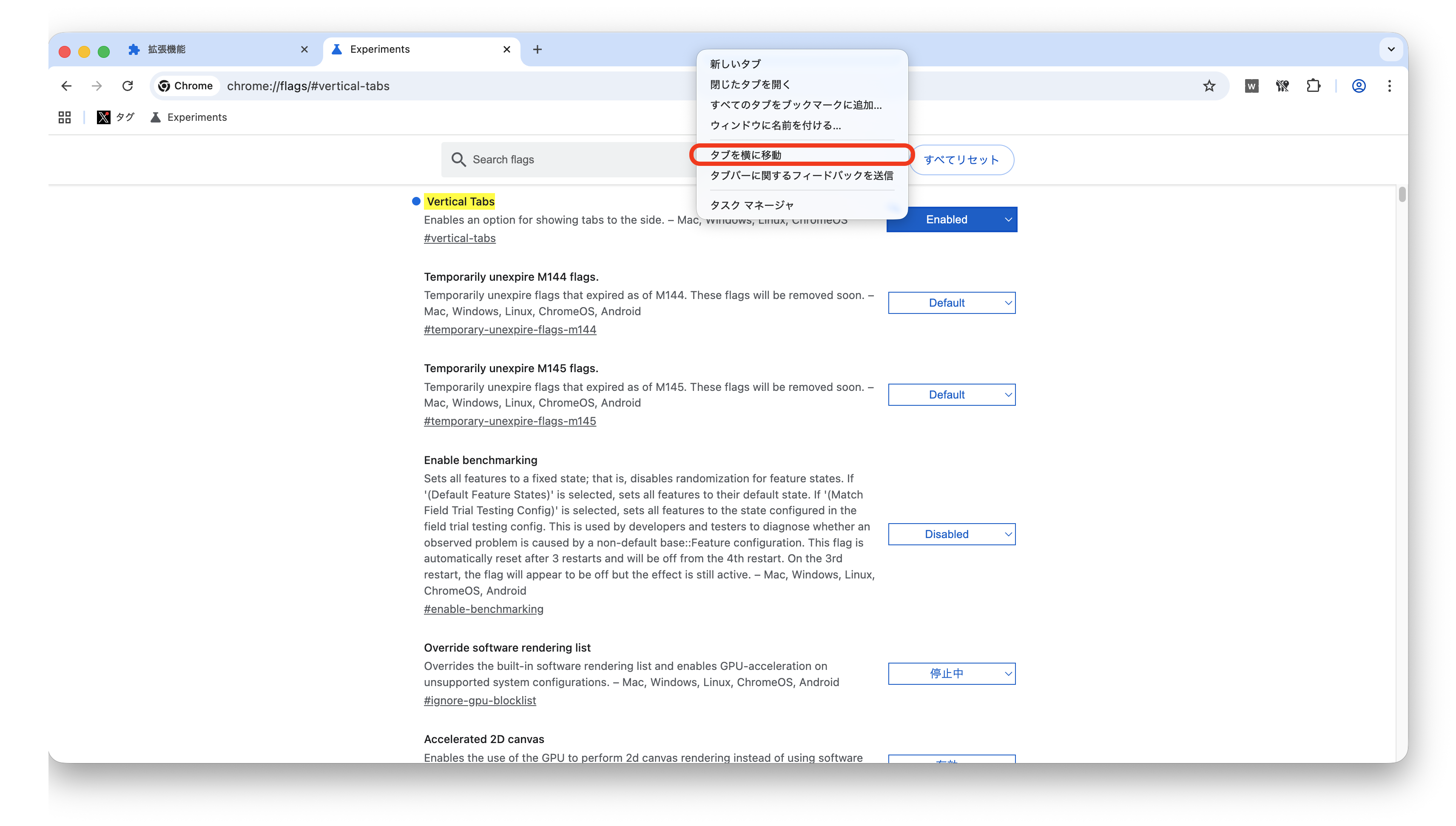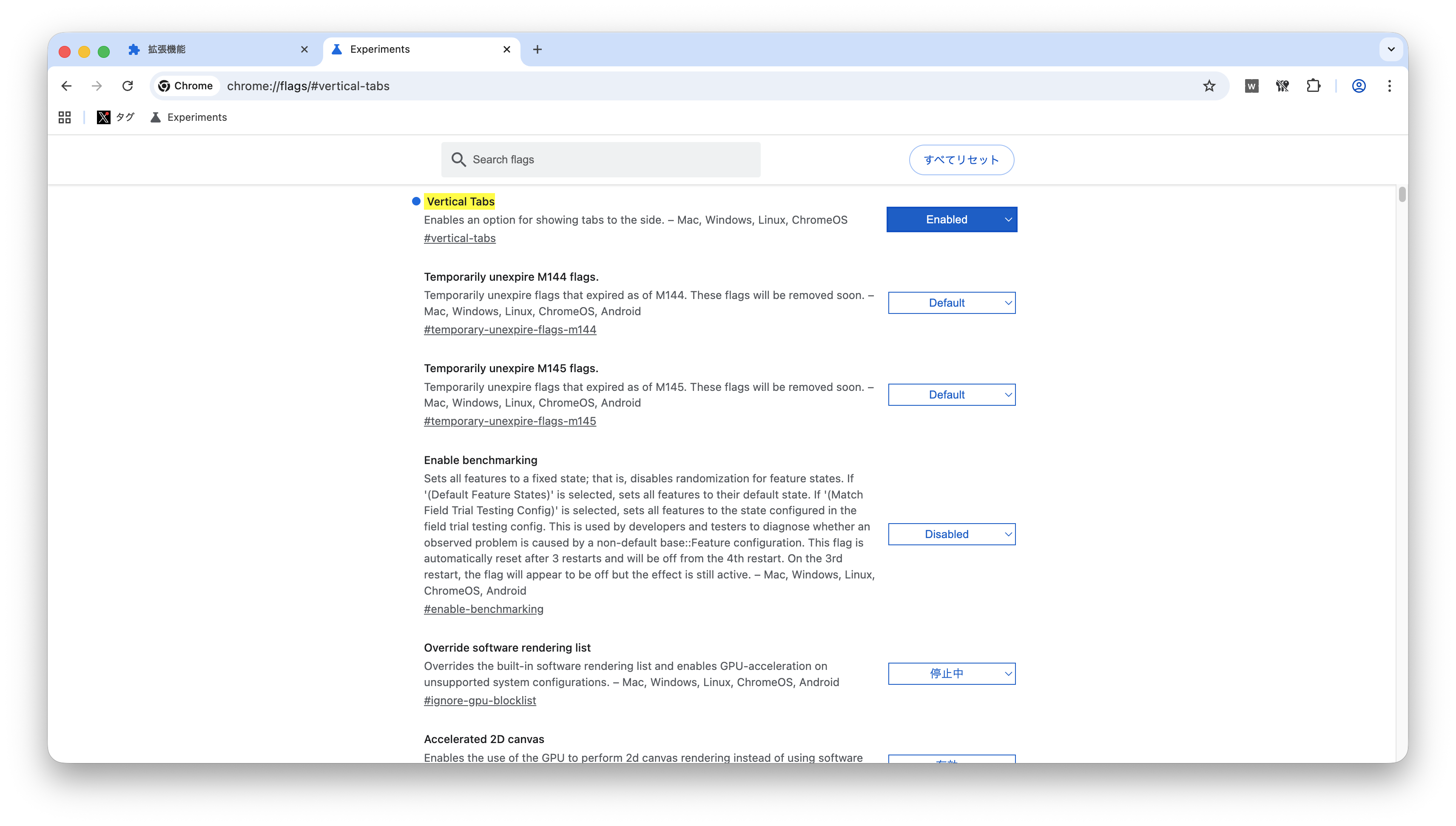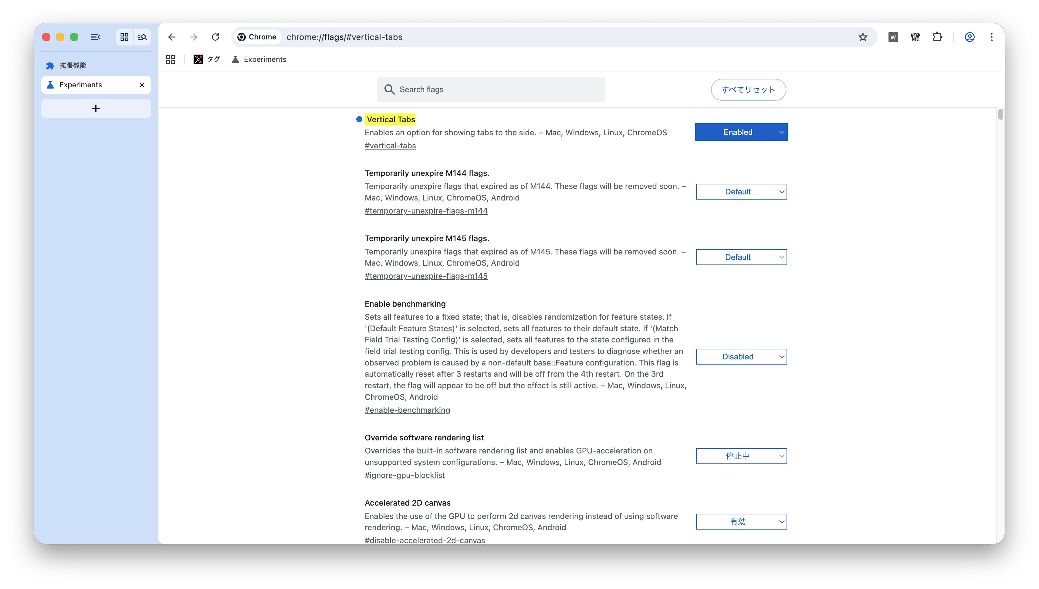 - 試験フラグ(Experiments)内の「Vertical Tabs」を「Enabled(有効)」にする 💡